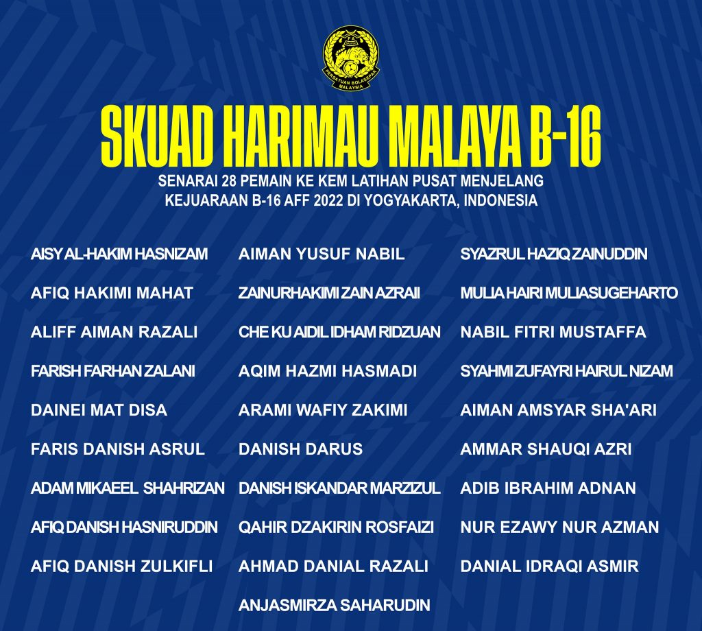 Skuad B-16 negara akan dibarisi oleh pemain dari dua akademi bola sepak utama di Malaysia iaitu Akademi Mokhtar Dahari (AMD) dan Akademi Johor Darul Ta’zim (JDT).
