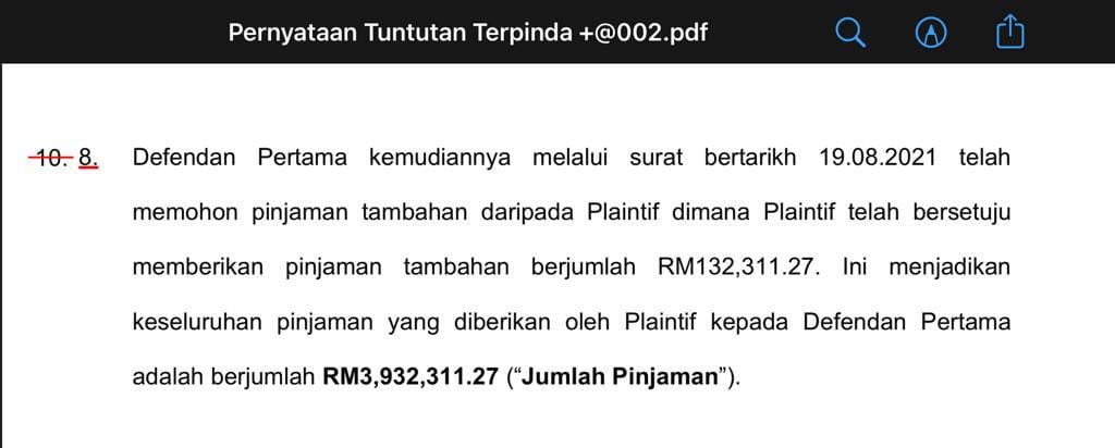 Beliau pada masa sama turut memuat naik tangkap layar penyataan tuntutan yang mendedahkan sedikit butiran mengenai pinjaman yang diminta oleh KAFA pada Ogos 2021.