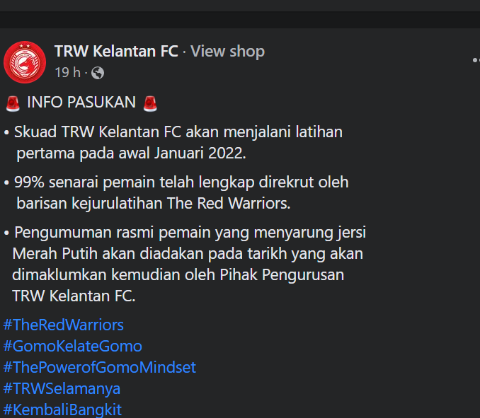Jika pasukan lain sedang rancak mengumumkan pemain-pemain yang akan menyertai pasukan mereka untuk saingan Liga Malaysia musim hadapan, TRW Kelantan FC hanya memuat naik memaklumkan mengenai rancangan mereka sahaja.