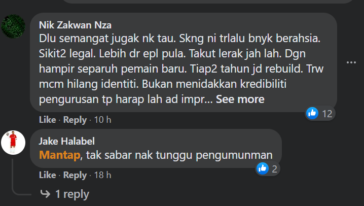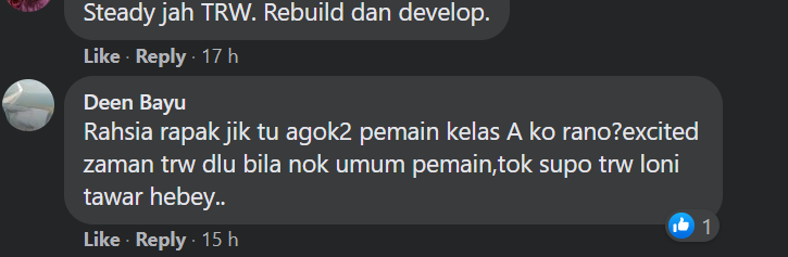 “Dulu semangat juga nak tahu. Sekarang ini terlalu berahsia. Sikit-sikit ‘legal’. Lebih dari EPL pula. Dengan hampir separuh pemain baru. Tiap-tiap tahun jadi ‘rebuild’. TRW macam hilang identiti. Bukan menidakkan kredibiliti pengurusan tapi harap ada perubahan baik dari segi pemain dan ‘merchandise club’.”