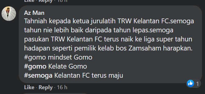 “Tahniah kepada ketua jurulatih TRW Kelantan FC, semoga tahun ini lebih baik daripada tahun lepas. Semoga pasukan TRW terus naik ke Liga Super tahun hadapan seperti pemilik kelab harapkan,” tulis pemilik akaun Az Man.