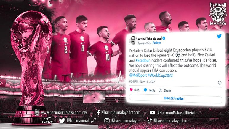 Namun disebalik keterujaan peminat bola sepak, dunia dikejutkan dengan dakwaan seorang pengguna Twitter bernama Amjad Taha mendakwa Qatar telah memberi rasuah kepada lapan pemain Ecuador berjumlah $7.4 juta untuk tewas pada perlawanan pembukaan.
