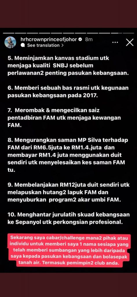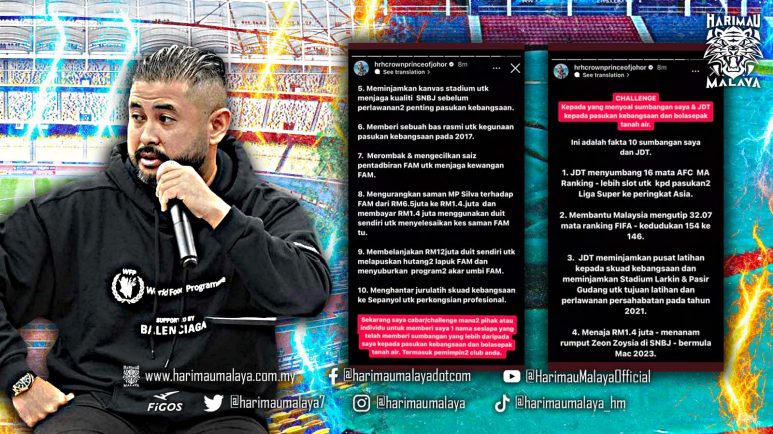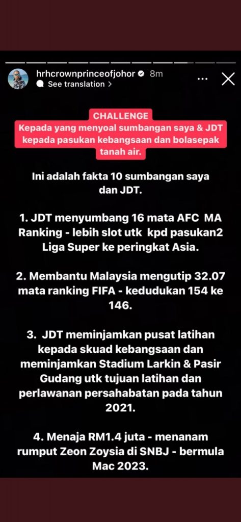 Posting yang dimuat naik di Instagram Story milik TMJ itu menyaksikan baginda telah melontarkan cabaran kepada mana-mana pihak yang mempersoal sumbangannya dan JDT kepada pasukan kebangsaan Harimau Malaya dan bola sepak tanah air.