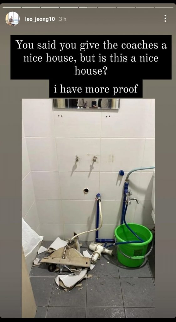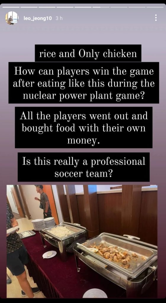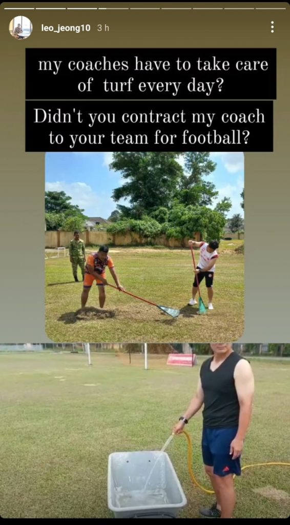 Jeong di media sosial turut mendedahkan beberapa gambar yang memperlihatkan keadaan padang latihan yang daif selain kelihatan Moon-sik terpaksa menjaga padang sebelum latihan bermula.