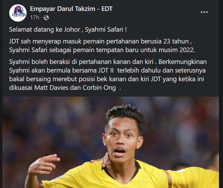Bekas pemain pertahanan Selangor FC, Muhammad Syahmi Safari telah sah menandatangani kontrak bersama pasukan juara lapan kali Liga Super, Johor Darul Ta’zim (JDT) untuk musim 2022.