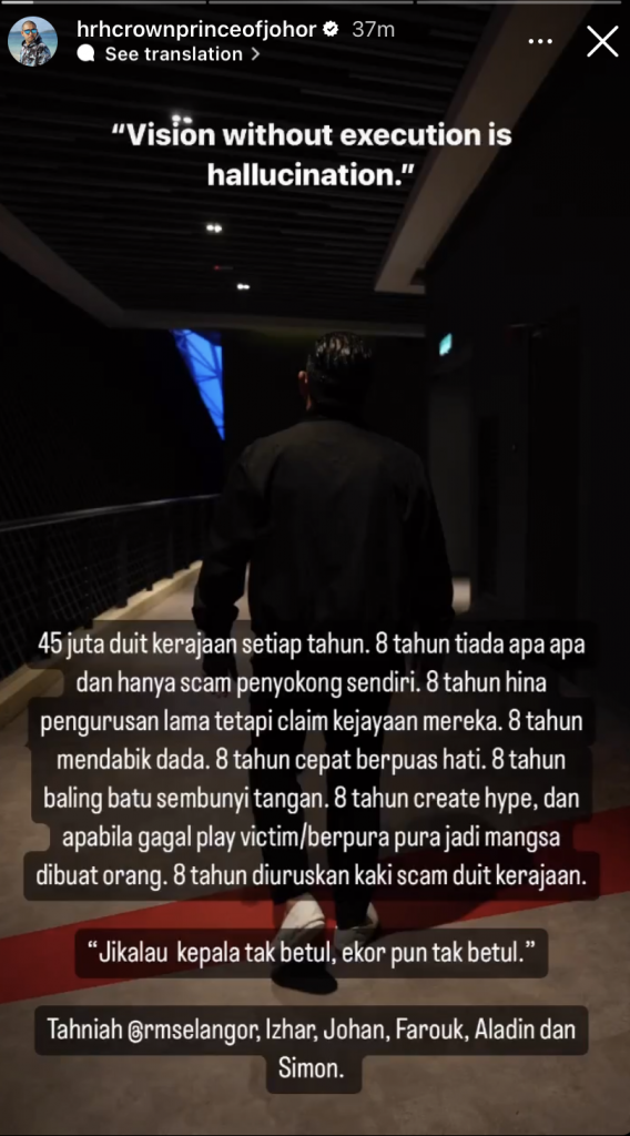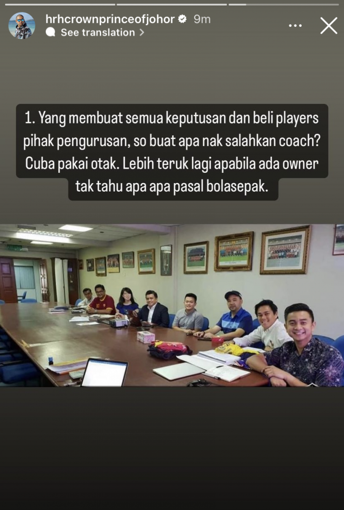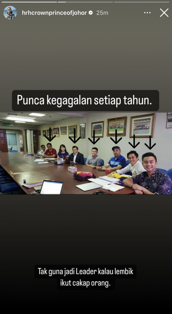 Susulan kegagalan skuad Red Giants itu, TMJ menerusi laman IG Story-nya telah mengkritik RMS dengan berkata; ‘Tak guna jadi Leader kalau lembik ikut cakap orang.’