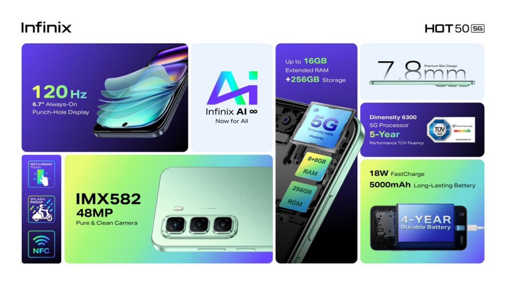 Dengan teknologi terkini dan reka bentuk ultra-slim yang anggun, Infinix HOT 50 5G mendefinisikan semula telefon pintar 5G peringkat permulaan dengan menawarkan prestasi, ketahanan, dan kuasa yang tiada tandingan.