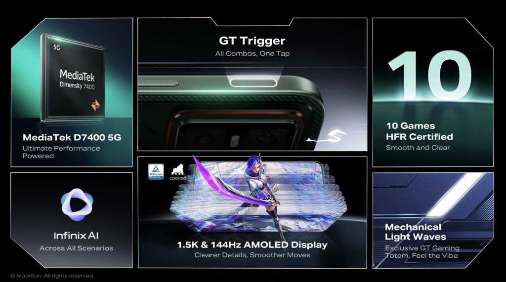 Berdasarkan kejayaan GT 30 Pro, GT 30 tampil di Malaysia dengan ciri eksklusif termasuk butang bahu kapasitif GT, paparan AMOLED 1.5K 144Hz, cipset MediaTek Dimensity 7400 5G, serta sistem penyejukan 3D Vapor Cloud Chamber Cooling (3DVCC) ciptaan Infinix. Dipadukan dengan lebih 25 ciri pintar AI, GT 30 menawarkan pengalaman lancar, tepat, dan imersif sama ada untuk bermain mahupun kegunaan harian.