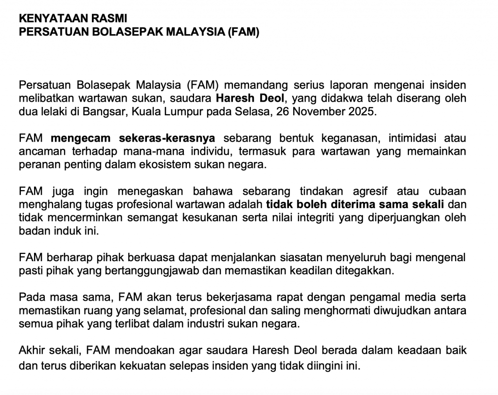 Persatuan Bolasepak Malaysia (FAM) menegaskan pendirian serius dan tegas berhubung insiden yang melibatkan wartawan sukan, Haresh Deol, yang dilaporkan diserang oleh dua lelaki di Bangsar, Kuala Lumpur pada Selasa, 26 November 2025.