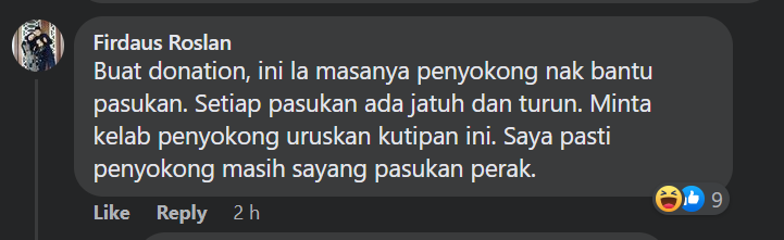 “Buat kutipan derma, ini la masanya penyokong nak bantu pasukan. Setiap pasukan ada jatuh dan turun. Minta kelab penyokong uruskan kutipan ini. Saya pasti penyokong masih sayang pasukan Perak,”