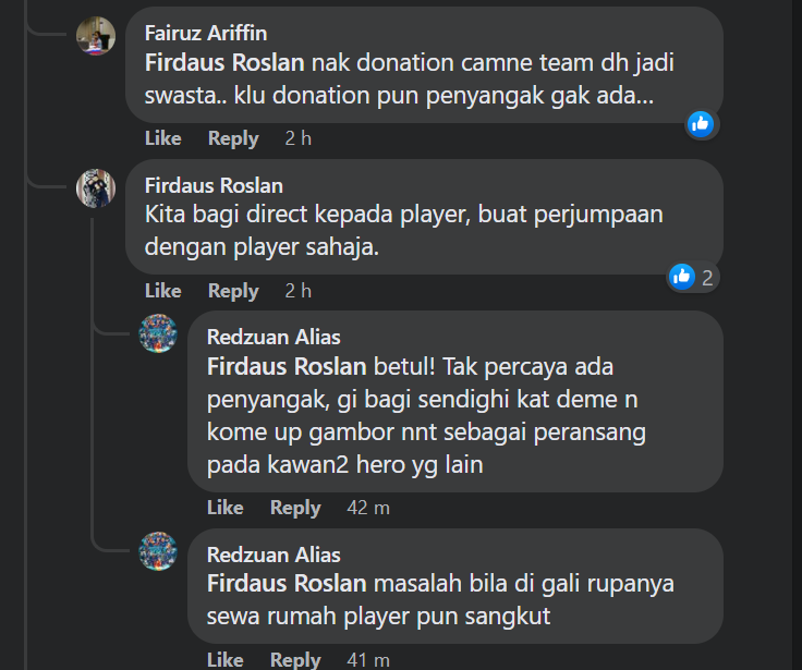Ramai yang bersetuju dengan cadangan Firdaus dan berkata kutipan derma itu patut diuruskan oleh kelab penyokong sendiri.