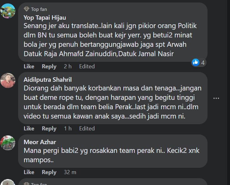 Dalam pada itu, ada juga peminat yang menyuarakan kemarahan mereka dengan berkata bola sepak Perak menjadi huru-hara dan rosak dek campur tangan orang politik.